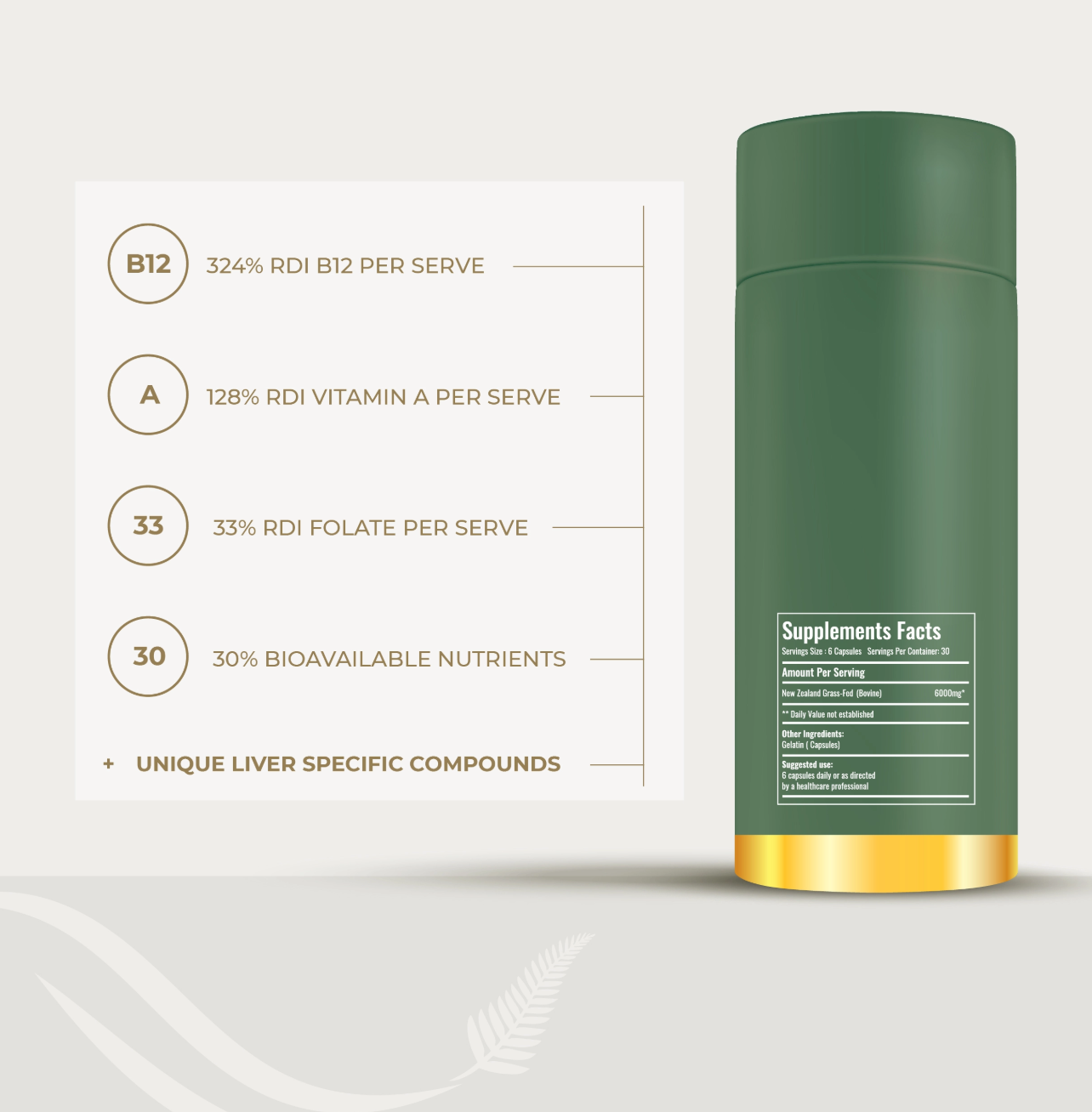 Beef liver contains 30+ bioavailable nutrients, minerals, co-factors, compounds and amino acids. Such nutrients include Active Vitamin A, Folate, B12, Haem Iron, Leucine, Riboflavin, Choline, Copper and CoQ10 just to name a few. AND unlike synthetic supplements, your body recognises and knows how to process these nutrients.