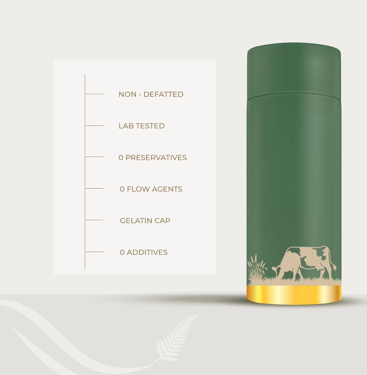 We source premium freeze-dried bovine ingredients from 100% grass-fed, pasture-raised New Zealand cattle, renowned for purity, superior quality, and world-class farming standards.